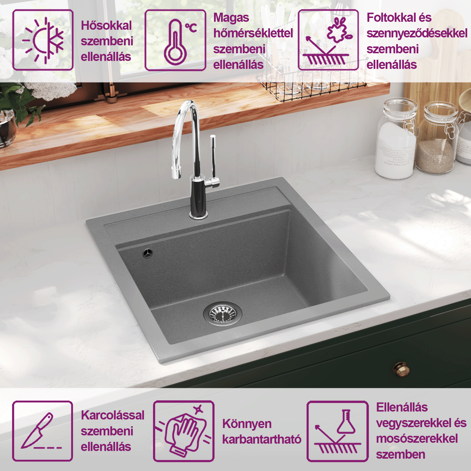 A kiváló minőségű gránit karcmentessé, ütés- és hőállóvá teszi a mosogatótálcát, valamint könnyű tisztítani. A részben előfúrt lyuknak köszönhetően könnyen kiütheti egy kisméretű kalapáccsal, vagy cső alakú szerszámmal a csaptelep beszereléséhez. Ugyanakkor nem sérül közben és máris a munkalapra szerelhető a csaptelep. Egy szűrőkosár is tartozik a szetthez, így a szennyeződés könnyedén eltávolítható.